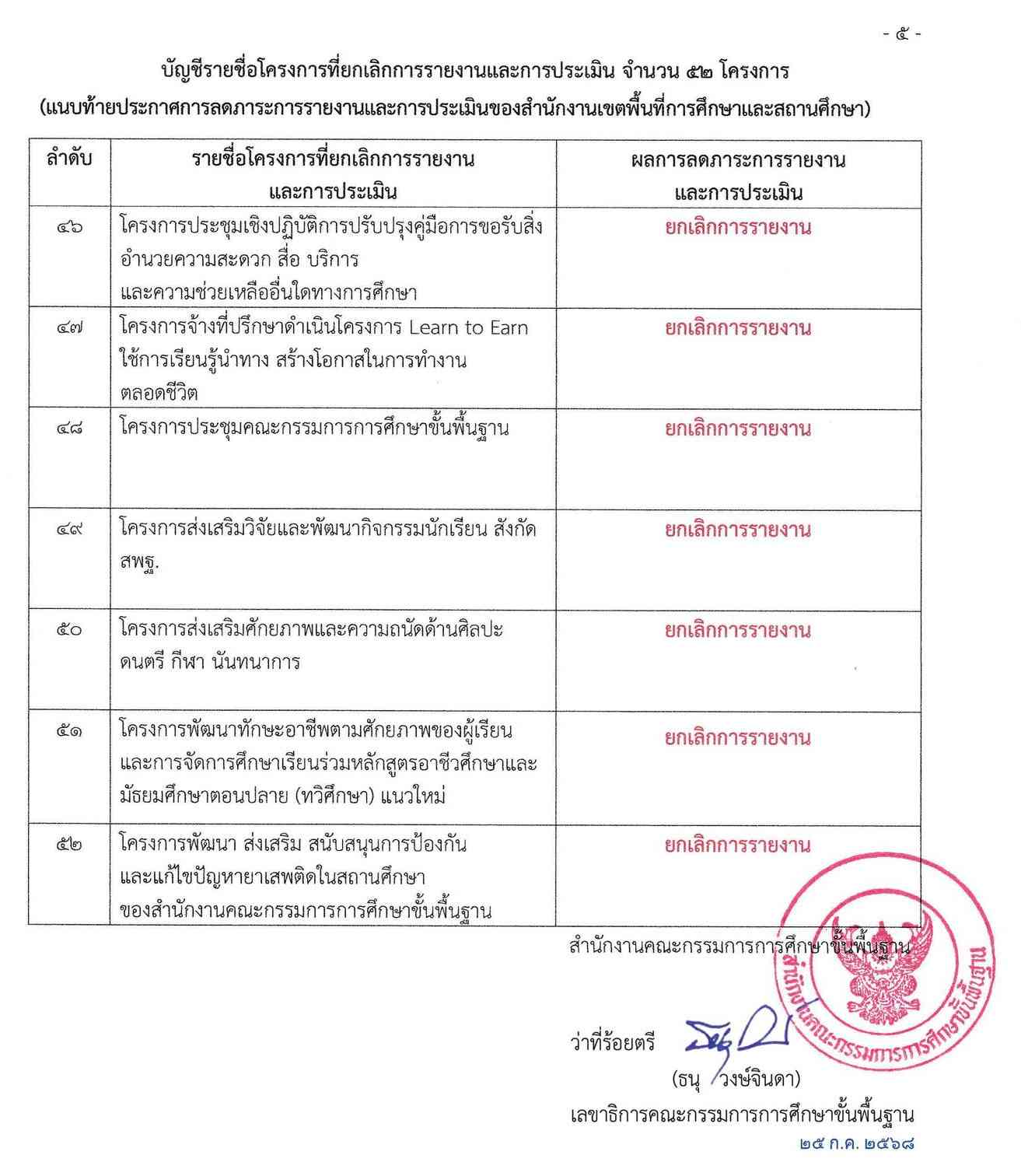 ยกเลิกการรายงาน ยกเลิกการรายงาน กเลิกการรายงาน ส่งผลให้ลดภาระที่ไม่จำเป็นและซ้ำซ้อน เรียนดี มีความสุข เพิ่มประสิทธิภาพ โดยมุ่งเน้นการจัดการเรียนการสอนและพัฒนาผู้เรียนได้เต็มศักยภาพ และมีประสิทธิภาพ มีทั้งหมด 52 โครงการ ตามรายชื่อโครงการที่ยกเลิกการรายงาน และการประเมิน ประกาศเมื่อ 25 กรกฎาคม 2568 มีดังนี้